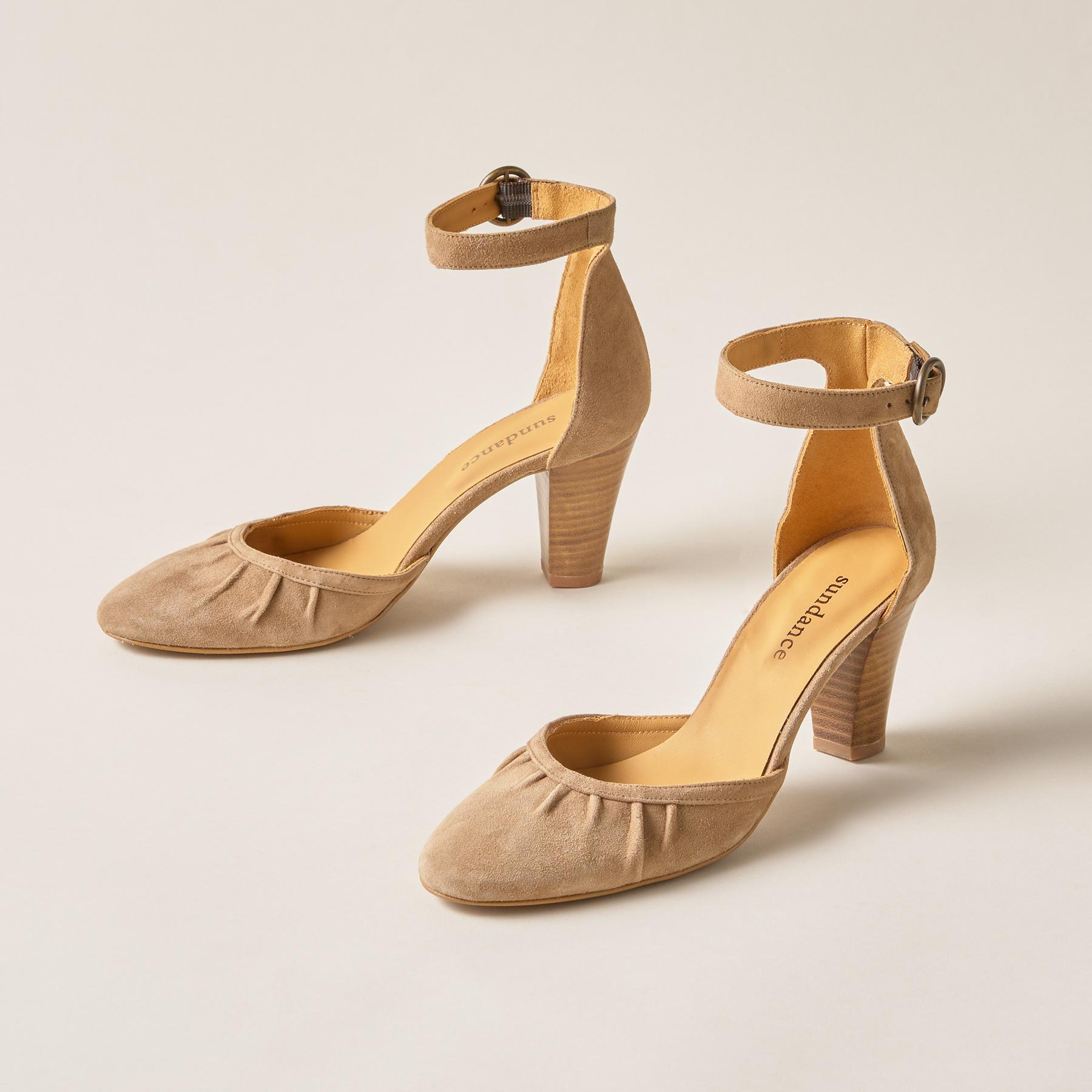 Stacked heels and pintucking at the toes adds refinement to these pretty suede heels with flattering. adjustable ankle straps. Spain. Exclusive. Euro whole sizes 36 to 41. 36 (US 6). 37 (US 7). 38 (US 8). 39 (US 9). 40 (US 10). 41 (US 11). 2-7/8 heel.