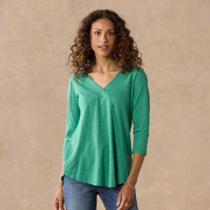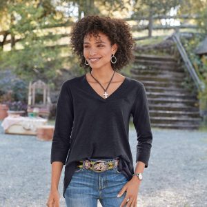 A Sundance favorite tee. now in three-quarter sleeve style. Comfy every day. this essential tee boasts subtle. directional seaming that flatters. V-neck and rounded hem. Cotton. Machine wash. Imported. Sundance exclusive. Sizes XS (0–2). S (4–6). M (8–10). L (12–14). XL (16–18). XXL (20–22). Approx. 29.75l.