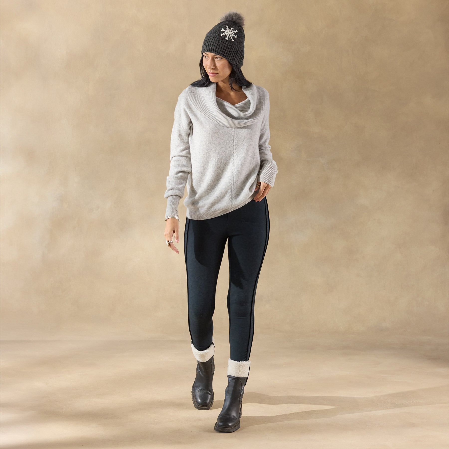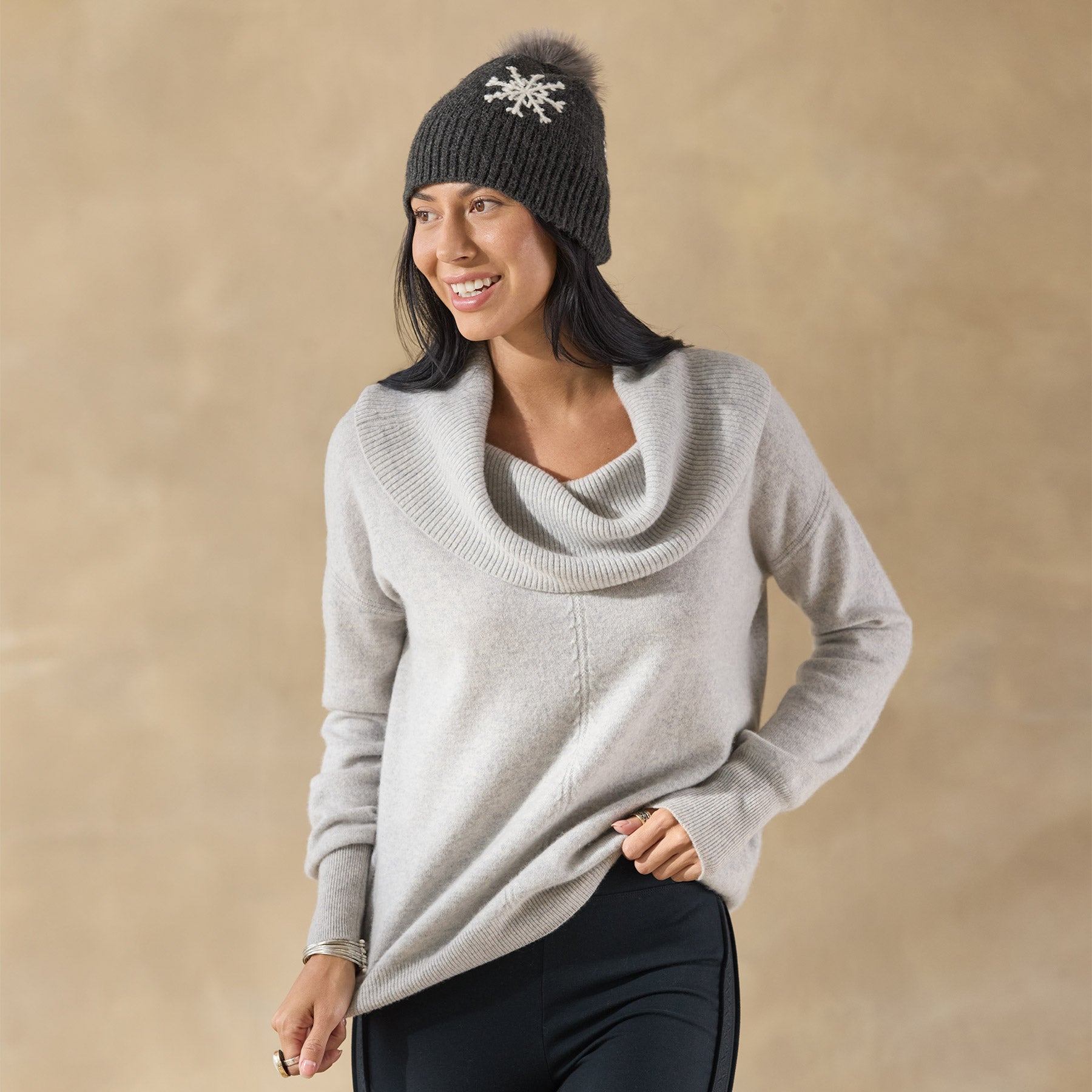 The coziest cowlneck sweater in lofty cashmere. with a ribbed cowl and sleeves. cable stitch detail at center front and back. and rib transfer details at armholes. Easy fit. Hand wash. Imported. Exclusive. Sizes XS (0–2). S (4–6). M (8–10). L (12–14). XL (16–18). XXL (20–22). Approx. 24l.
