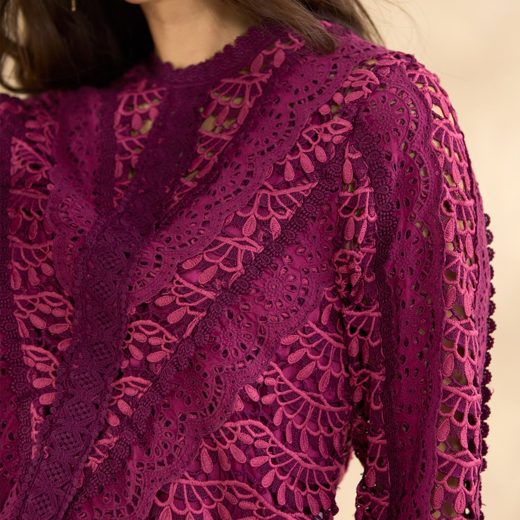 Luxurious allover lace adds elegance to every step of our detailed crocheted top with bold sleeves. scalloped bottom and so much texture. Invisible button closure at the back. Camisole included. Polyester/cotton/modal. Hand wash. Imported. Exclusive. Sizes XS (0–2). S (4–6). M (8–10). L (12–14). XL (16–18). XXL (20–22). Approx. 23.5l.