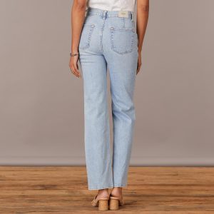 With slit pockets and front seams. these light-wash jeans combine function and style. Cotton/elastane. Machine wash. Made in USA. Sizes 24-32. Approx. 32 inseam. 10.5 rise. 18 leg opening.