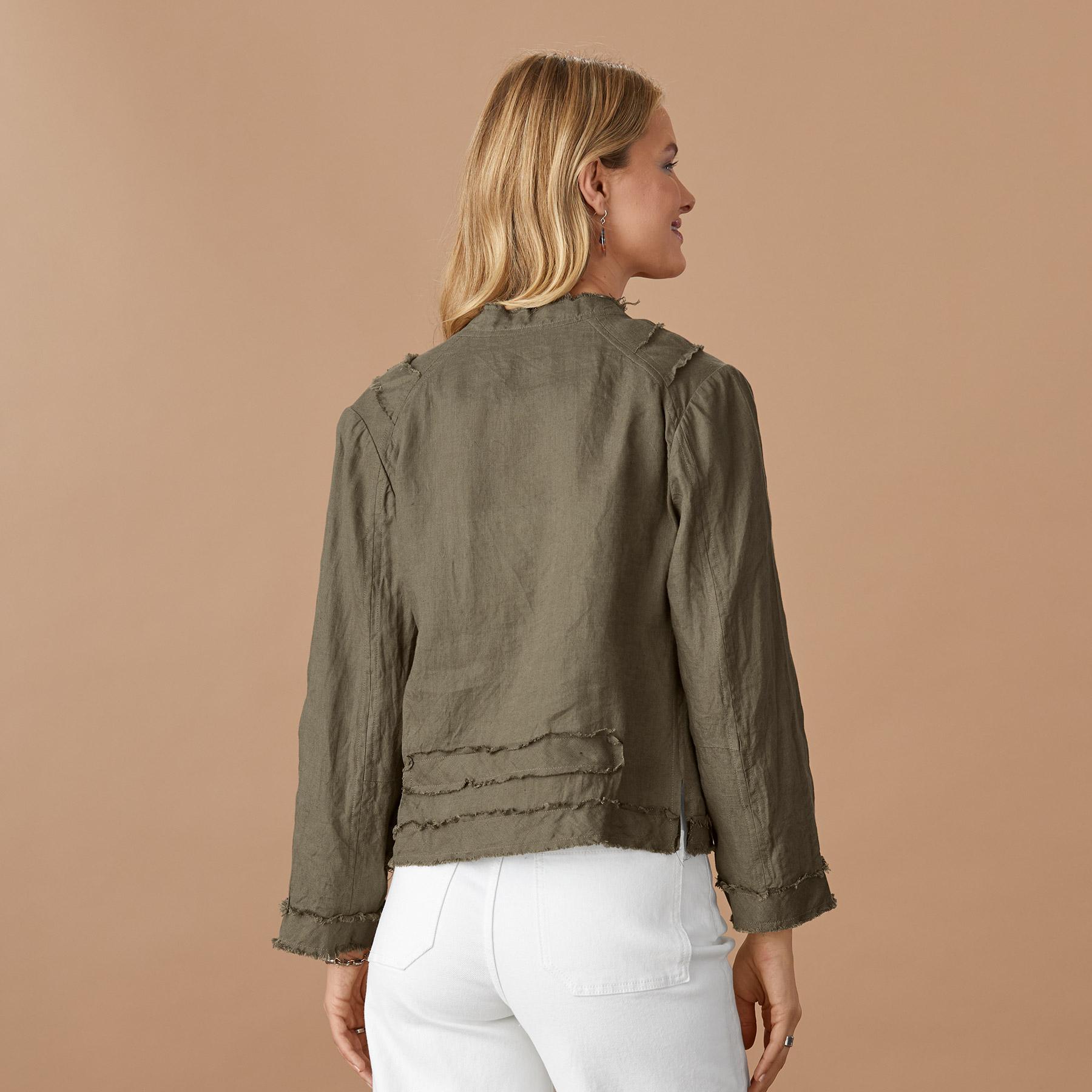 This effortless jacket features three pockets. buttons with loop closures. a distressed hem and stitch detail at the shoulders and hem. Linen. Hand wash. Imported. Exclusive. Sizes XS (0-2). S (4-6). M (8-10). L (12-14). XL (16-18). XXL (20-22). Approx. 22l.